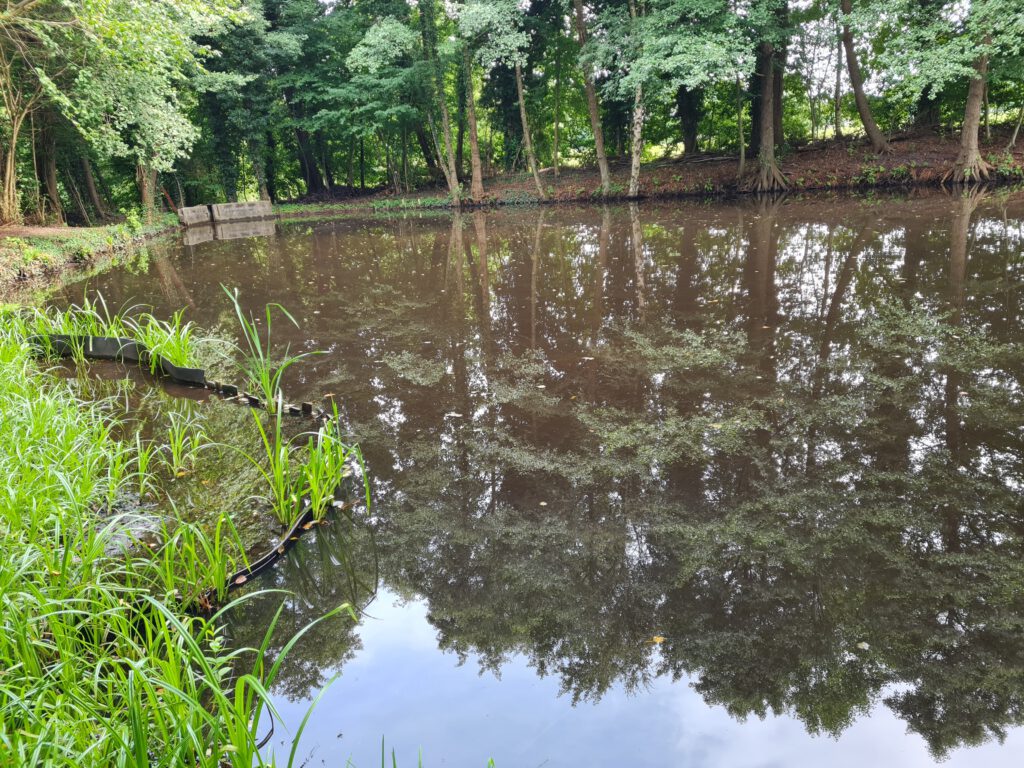 Es gibt einen Zu- und Ablauf, so dass der Teich immer mit frischem Wasser gespeist wird.